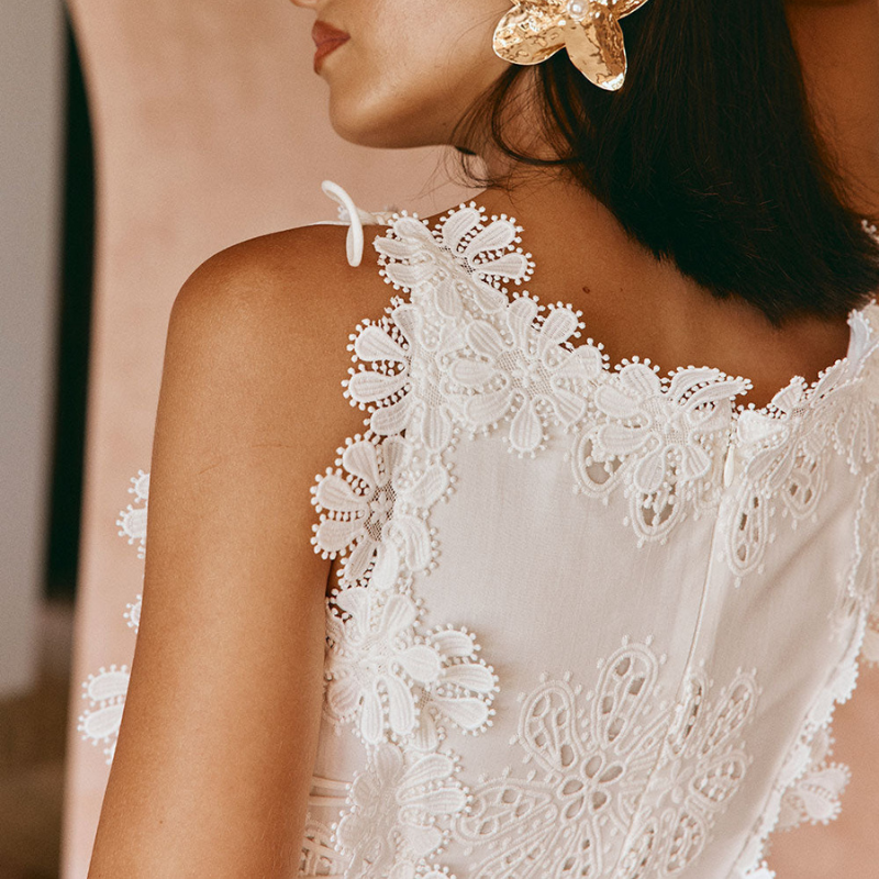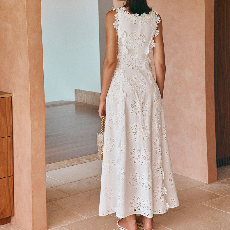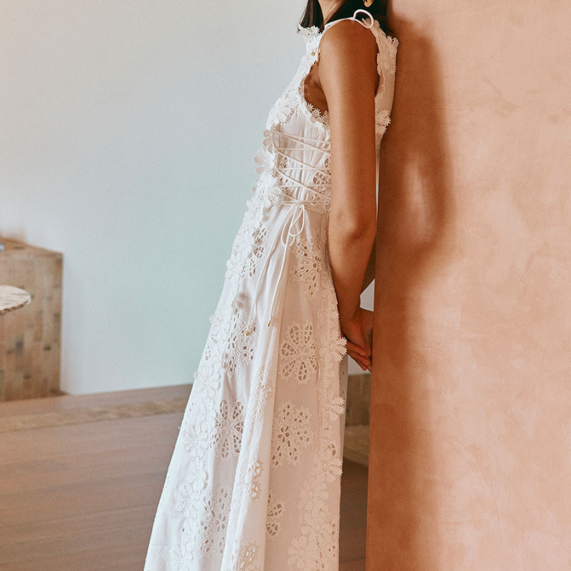 Denete kjolen indfanger essensen af moderne femininitet med sin yndefulde silhuet og delikate detaljer. En blød bådudskæring indrammer ansigtet, mens snøredetaljer i taljen skaber en flatterende figur. Kaskaderende blomsterbroderi flyder ubesværet langs den lange nederdel og tilføjer romantisk charme til hvert skridt. Perfekt til havefester, solbeskinnede gåture og raffinerede sommersammenkomster.