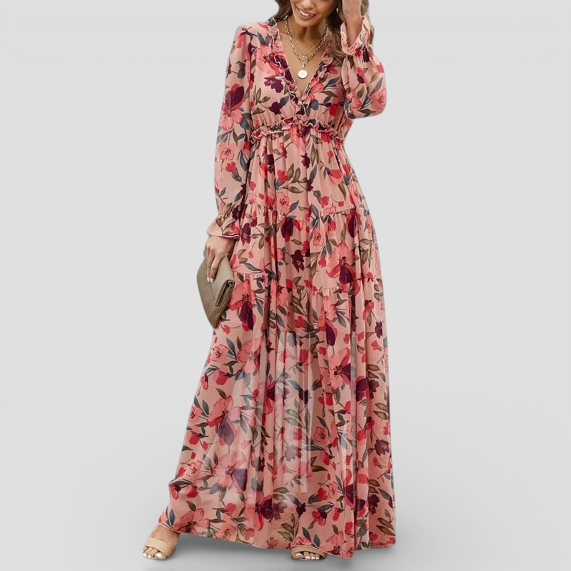 Helen kjolen er den perfekte blanding af elegance og alsidighed til ethvert miljø. Dens flagrende blomsterprint og luftige maxi design sikrer komfort, samtidig med at den tilføjer feminin charme til dit se. Den iøjnefaldende V hals og lange ærmer skaber en raffineret silhuet, der gør Helen ideel til afslappede udflugter, ferier eller sofistikerede begivenheder. Ubesværet stil møder komfort hele dagen i dette uundværlige tøj i garderoben.