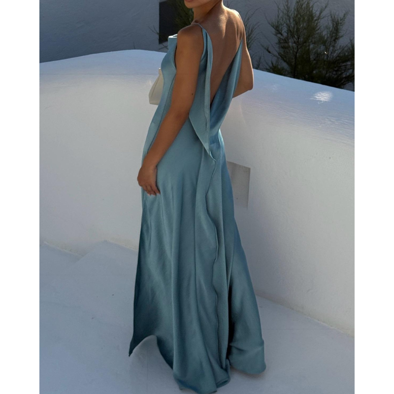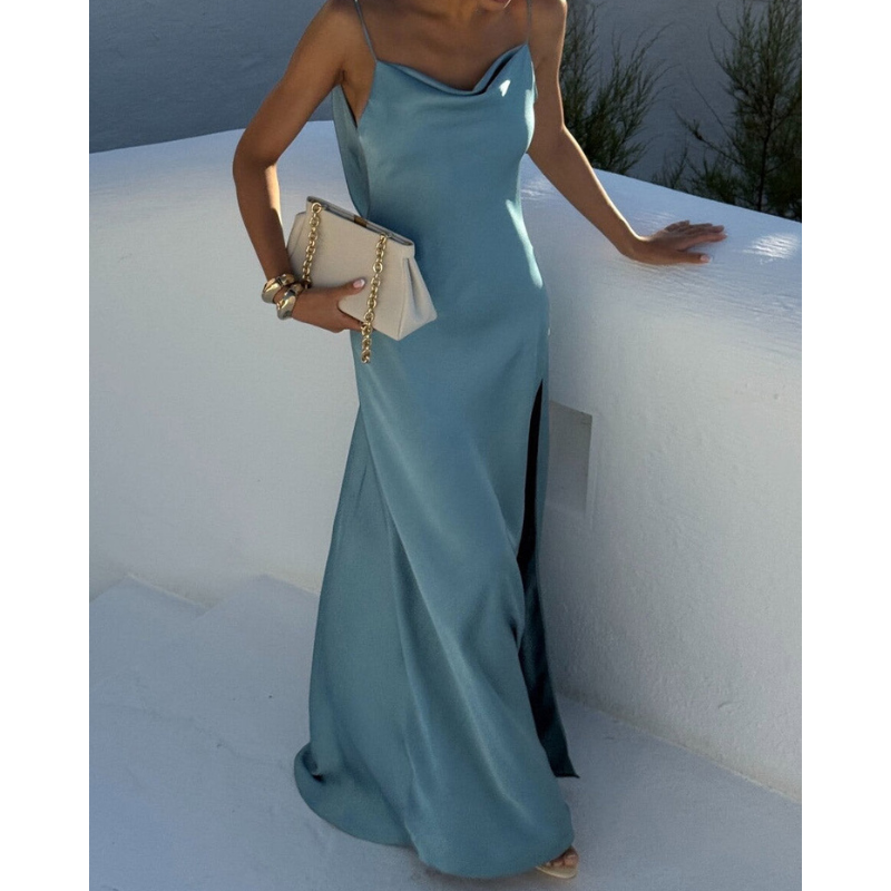 Glide din indre diva løs med Malou, en elegant og forførende lang satinkjole designet til at betage. Dens slanke pasform smyger sig perfekt ind til kroppen, mens den dristige slids til lårene tilføjer et strejf af drama. Den draperede halsudskæring kombineret med et ærmeløst snit skaber en uimodståelig blanding af elegance og charme. Perfekt til særlige lejligheder, dette glamourøse stykke er dit valg til uforglemmelige aftener.