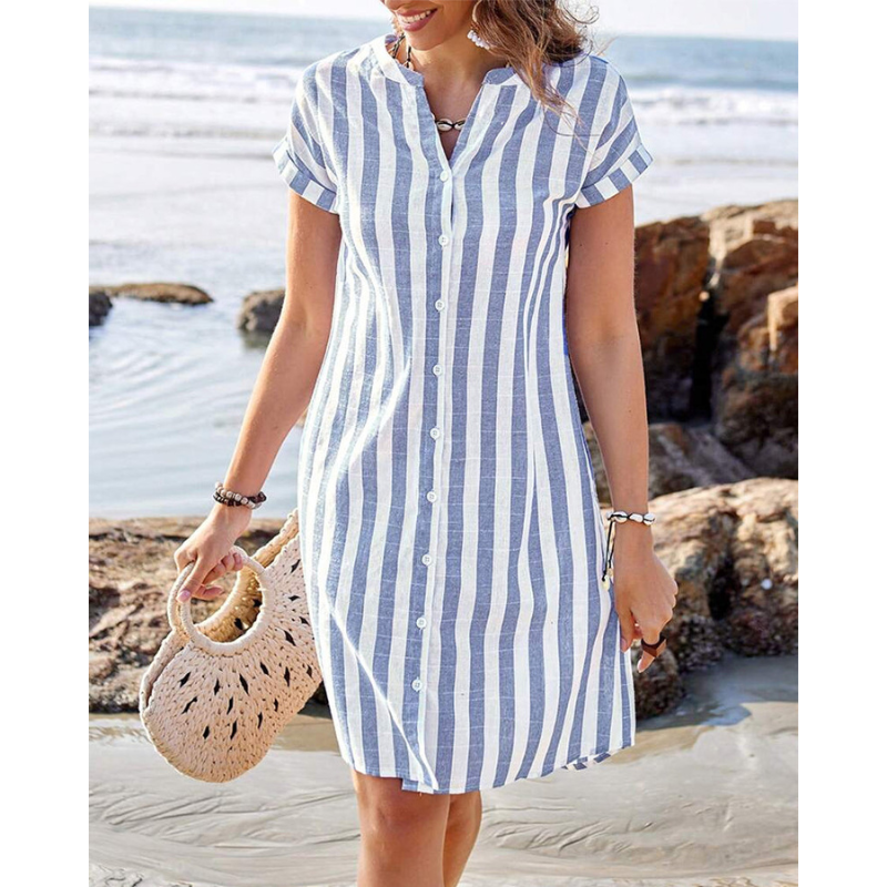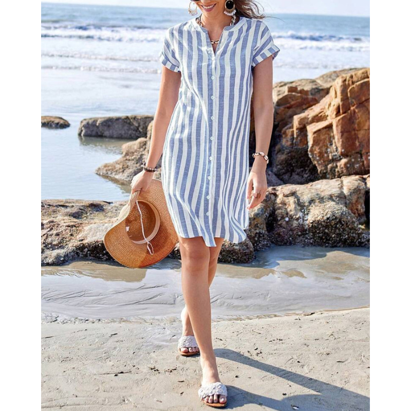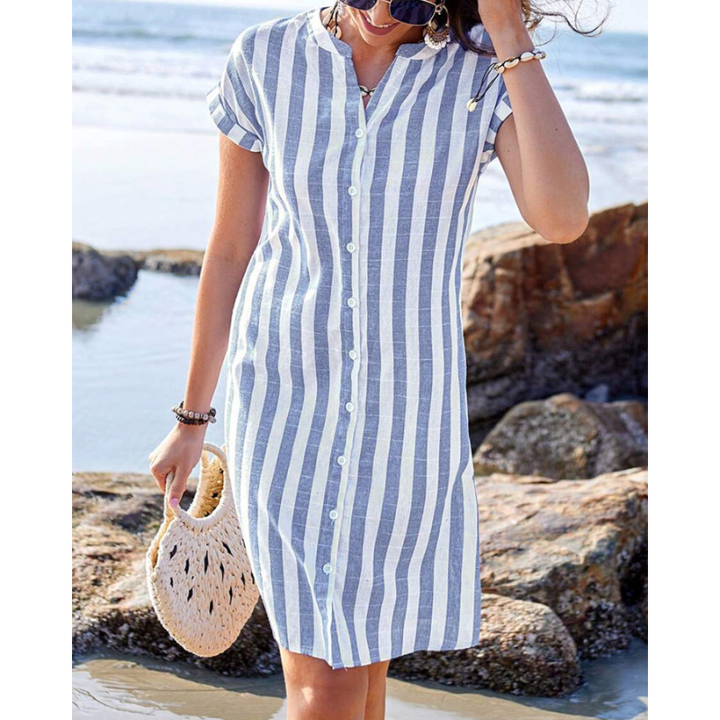 Lad din stil fortælling for sig selv med Martine, den stribede skjortekjole, der er designet til at fremhæve din hverdagselegance. Med sin klassiske V udskæring og bløde, åndbare stof blander Martine sofistikering med afslappet komfort. Perfekt til brunch, kontordage eller afslappede aftener, den er flatterende og holder dig komfortabel fra solopgang til solnedgang.