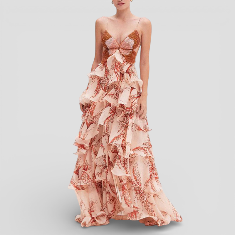 Nahia er din fantasi, der vækkes til levende en kjole, der hvisker frihed, elegance og ubesværet femininitet. Med bihule kaskader af flæser og yndefulde juveludskæring bevæger den sig som poesi i bevægelse. Ideel til solnedgangsfester, boheme flugter eller romantiske aftener Nahia lader dig føle, at du svævefly gennem både drømme og beundrende blikke.