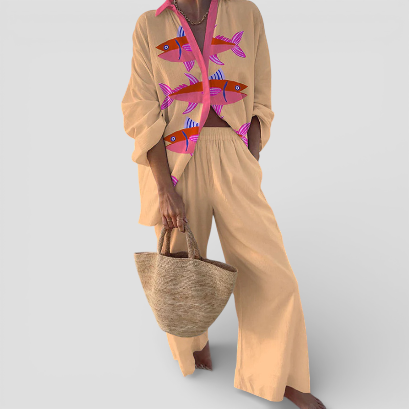 Evalisse - Elegant lyserødt kjolesæt med fiskemønster