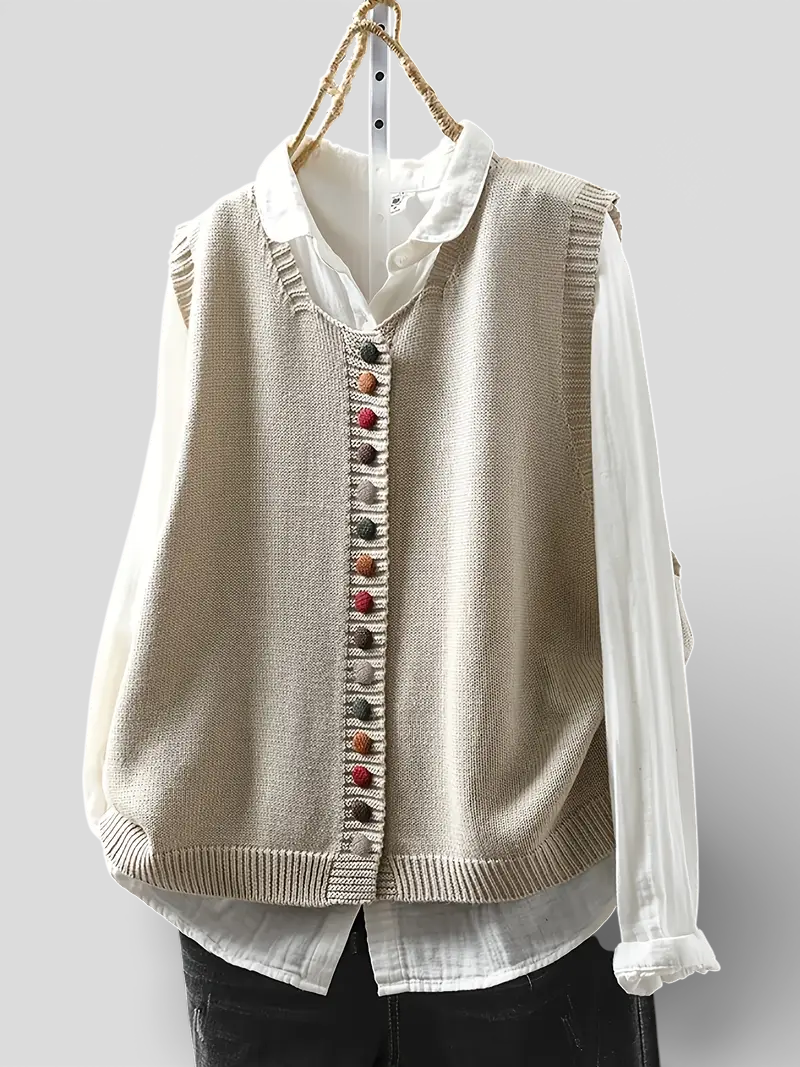 Gør din garderobe komplet med Clara - Klassisk Ærmeløs Strikvest – et alsidigt og elegant valg til hverdagen.